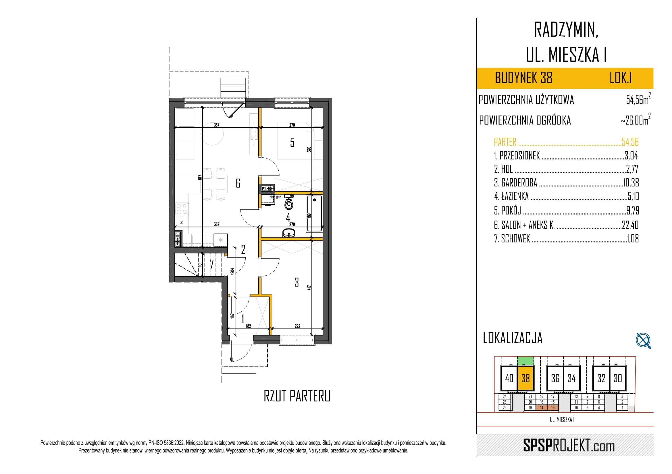12 lokale na parterze o powierzchni 54,56 m2 – salon z aneksem kuchennym, 2 sypialnie + łazienka + ogródek około 25 m2 + 2 parkingi.