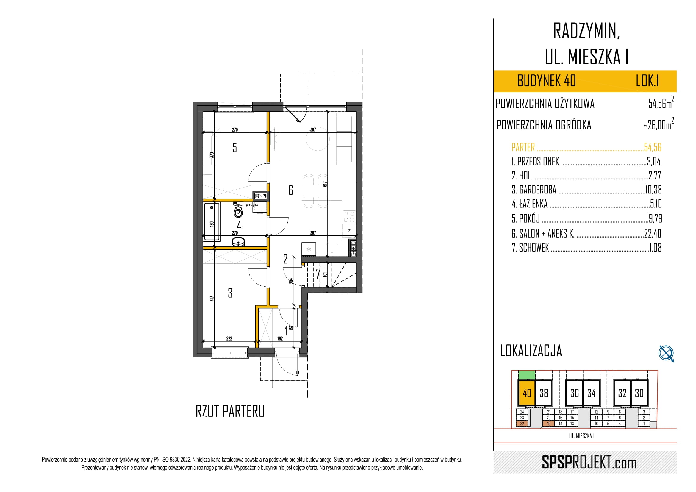 12 lokale na parterze o powierzchni 54,56 m2 – salon z aneksem kuchennym, 2 sypialnie + łazienka + ogródek około 25 m2 + 2 parkingi.